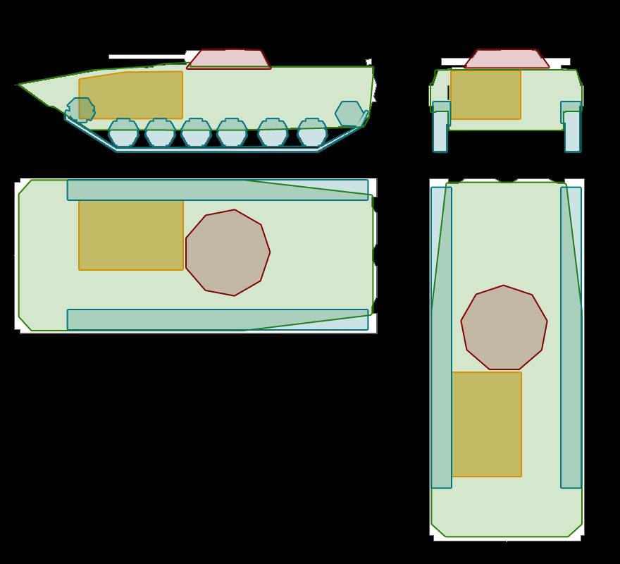 LEGEND Green = Hull Orange = Engine Light blue = Treads Maroon = Turret