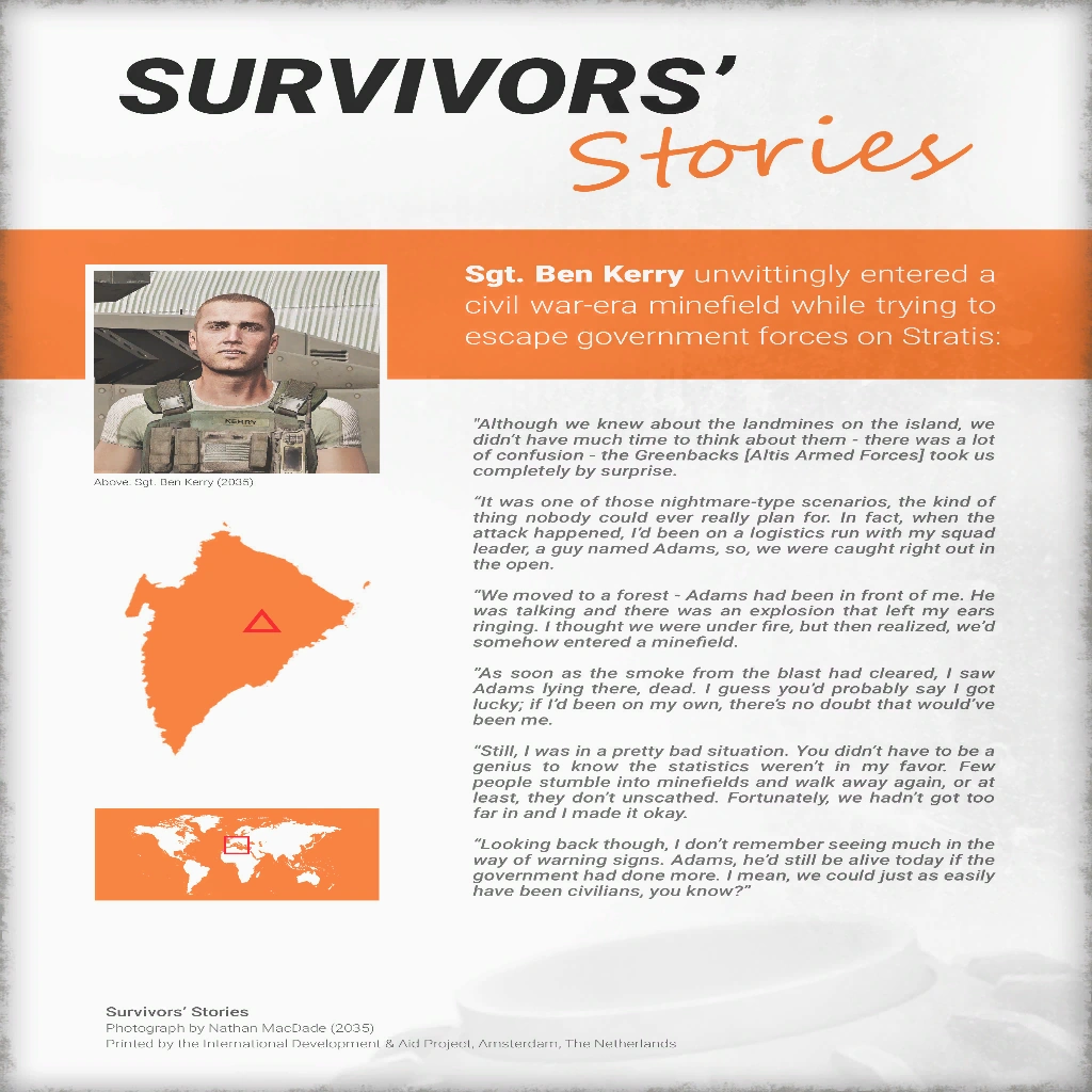 Kerry detailed his account witnessing the death of his former squad leader up close. He largely attributed fault towards the previous Altian government for not placing more clear warning signs around the minefields. Most of all, he reflected grimly on the fact that had Adams not been taking point, Kerry would have been the one lying dead in the forests of Stratis on that very day.[218]
