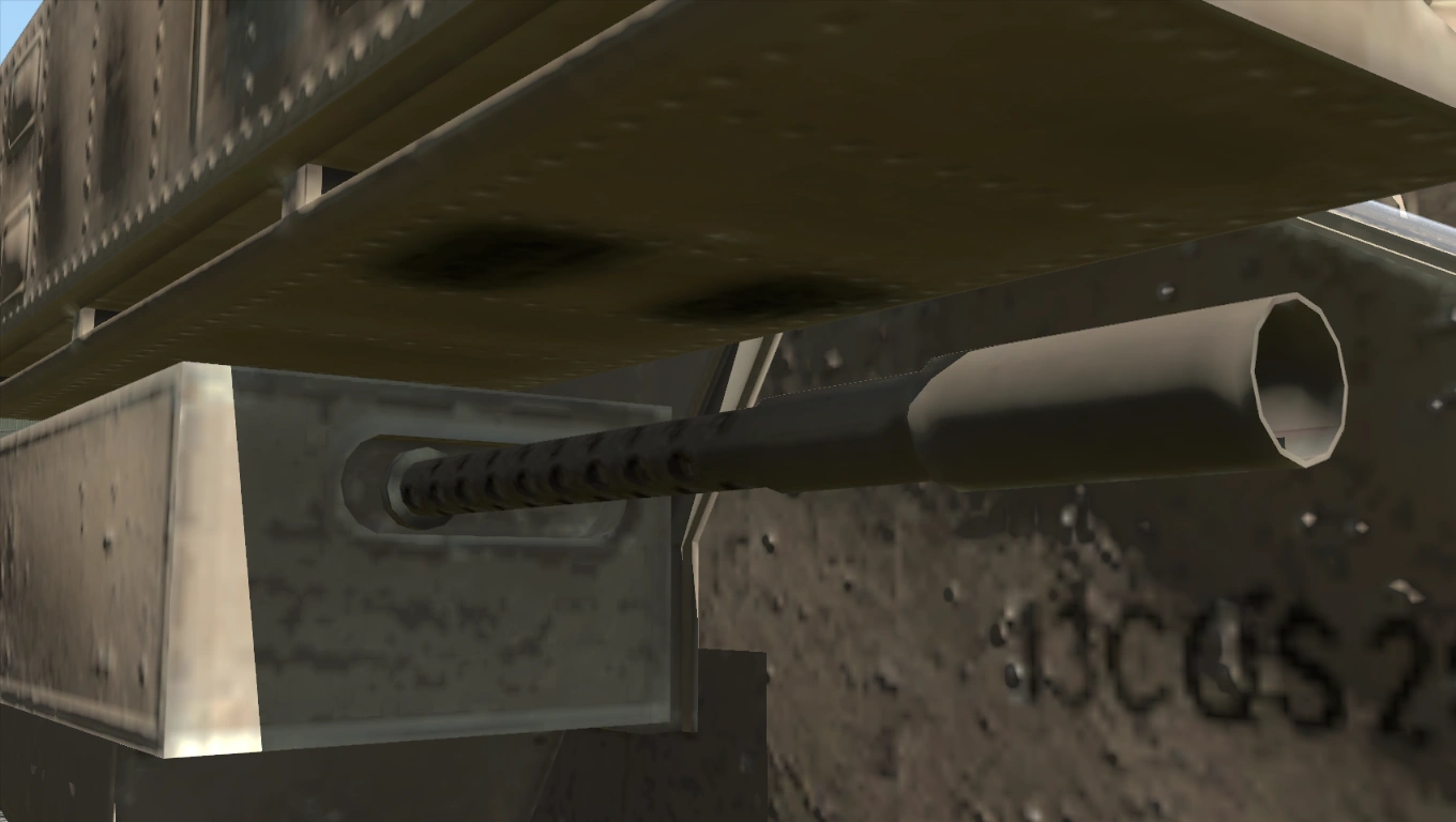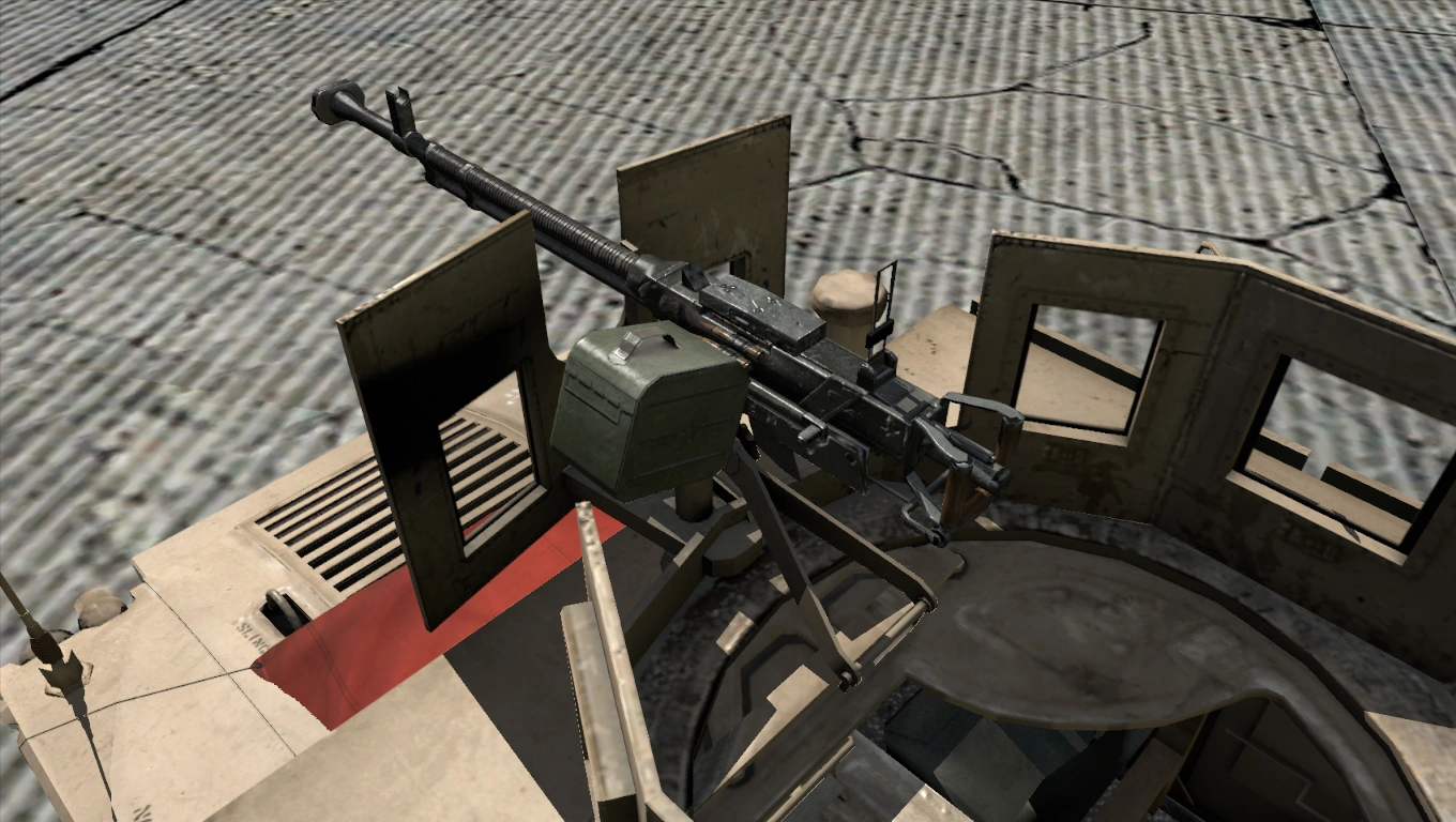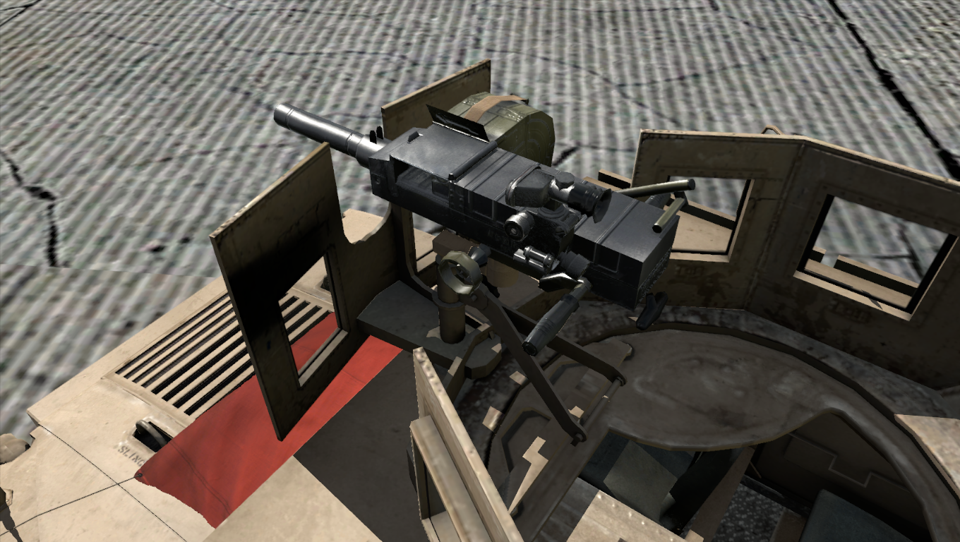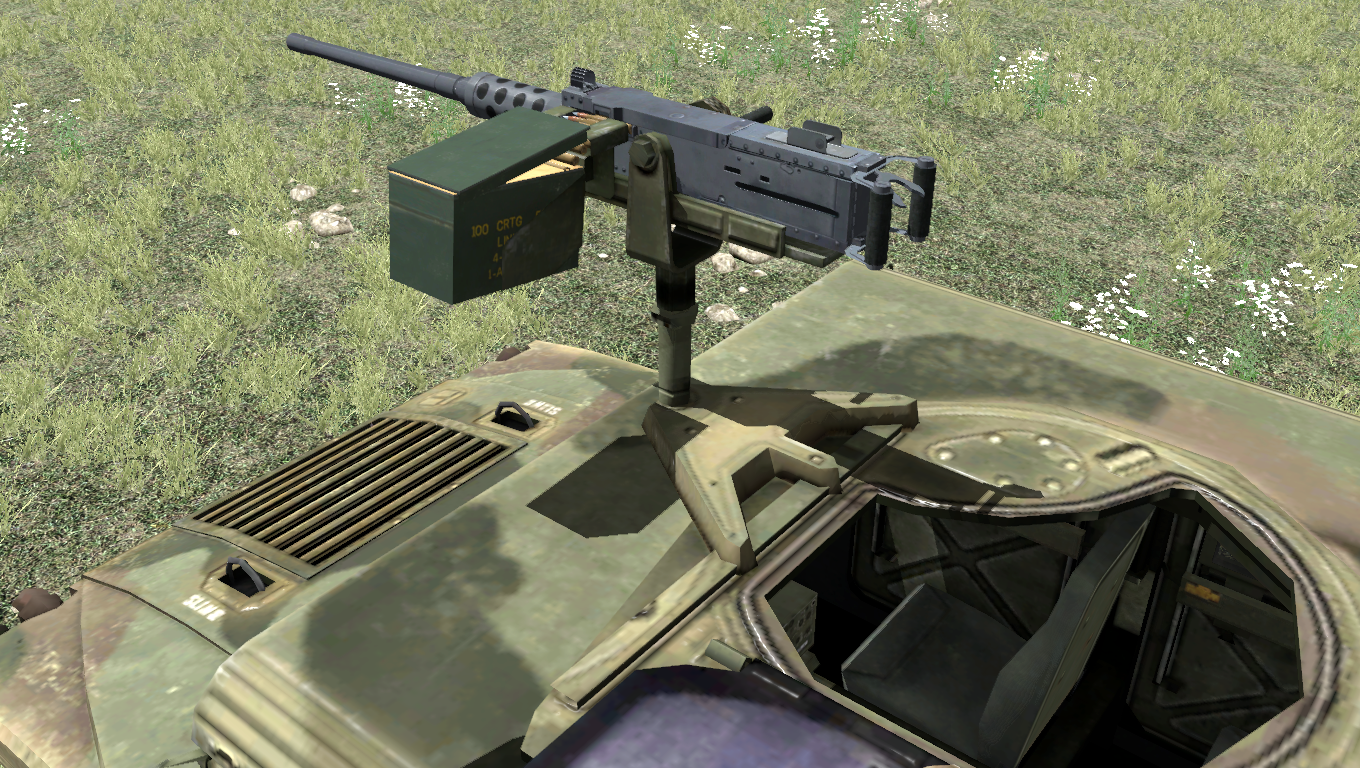 The vehicle's roof is fitted with an M2 .50 cal heavy machine gun.[A1CfgV 9] This HMG feeds from 100-round belts stored in ammocans. The gunner has access to 6× ammocans for a combined total of 600 rounds.[A1CfgV 17] This variant has the ability to transport up to three passengers.[A1CfgV 3]