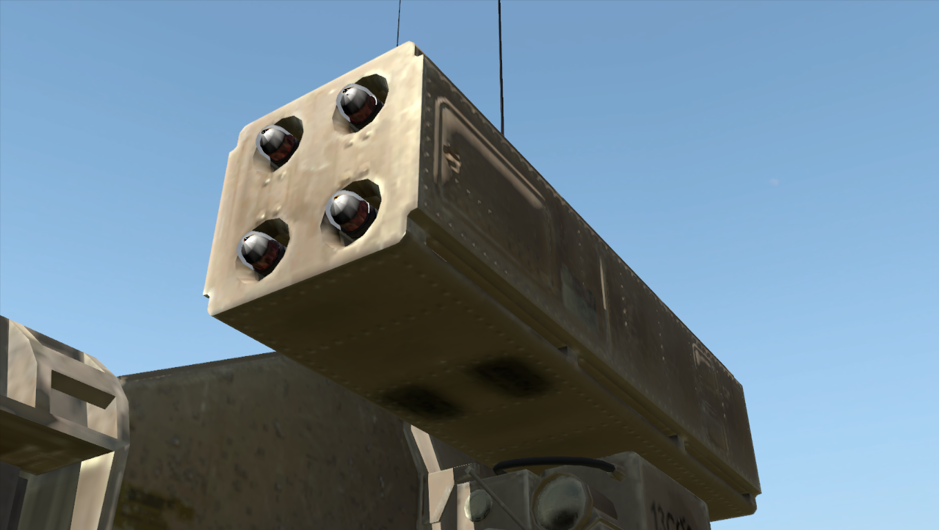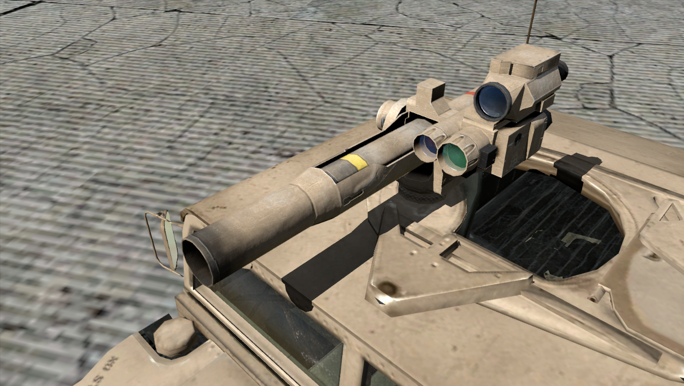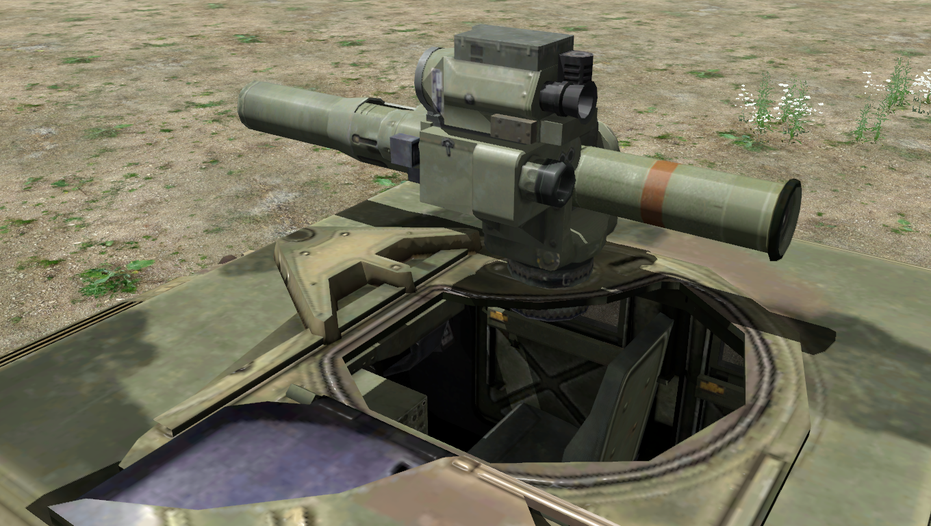 It is specifically armed with an M220 TOW launcher that can fire SACLOS-guided[A1CfgA 1] surface-to-surface anti-tank missiles.[A1CfgV 11] One missile is always pre-loaded while another 5× are left in reserve, providing a combined pool of 6× missiles.[A1CfgV 19] This variant can transport up to three passengers at a time.[A1CfgV 5]