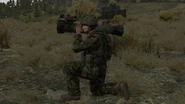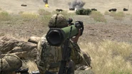 It can load and fire missiles that are fitted with 150 mm high-explosive anti-tank (HEAT) warheads. The launcher comes with an integrated ACOG scope that has a fixed magnification of 4.01x.[CfgWp 4][CfgWp 5][Formula 1] It takes the launcher's seeker only two seconds to lock onto a target.[CfgWp 6] The launcher's seeker is completely immune to defensive smoke countermeasures and cannot have its lock-on be disrupted.[CfgWp 7][note 1]