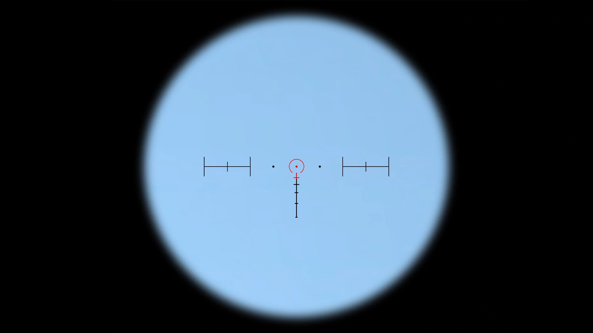The reticle comprises an illuminated horseshoe with black BDC markers. However, none of these markings actually have a purpose; locking on with the NLAW only requires the target vehicle to be visible within bounds of the scope's reticle (up to the black border). It is not necessary to point the centre of the reticle directly onto the vehicle's centre-of-mass.