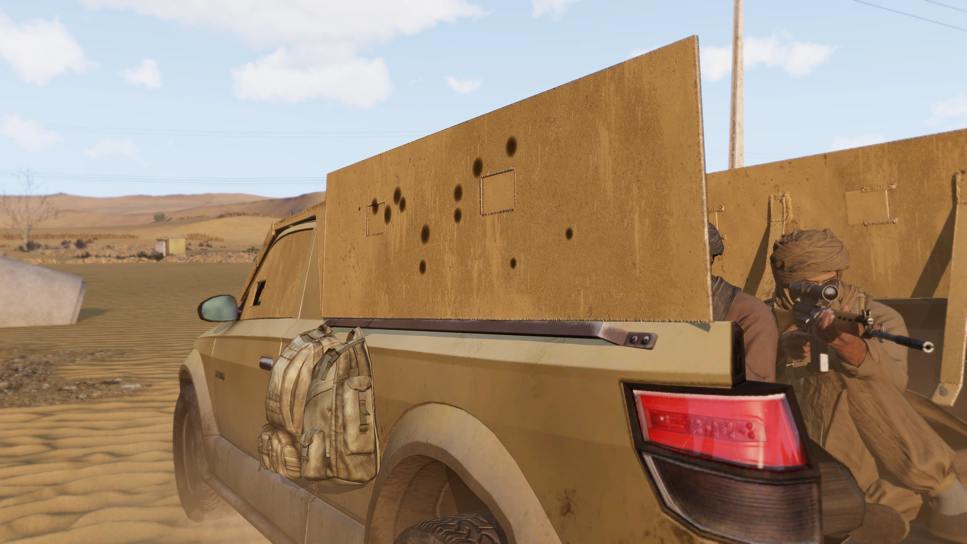 This armour also offers only a sliver of protection from infantry small arms; hits from large calibre projectiles (e.g. 12.7 mm sniper rounds or .338 marksman rifles) and anti-vehicle grenades will still pierce the plates and severely injure or outright kill the vehicle's occupants.