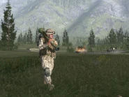 ↑ARMA 2:Operation Arrowhead 2010 [Video Game], Bohemia Interactive a.s., Operation Arrowhead, Pathfinder, "Mornin' Herrera! The first op was a snap, now we gotta continue pushing north. Your assignment today is to recon the Naran Darre pass and take it by force if possible. You'll be at the vanguard of Malarky's recon element, callsign "Cowboy." The pass is defended by Takistani regulars who won't give up easily, but we need to take it before any of their reinforcements arrive. Report in once it's secured. Understood?"